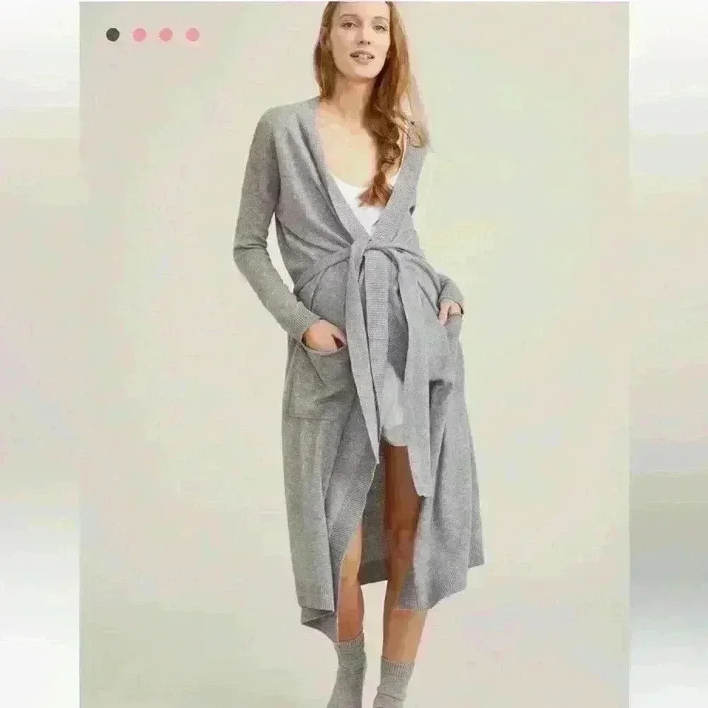 Made of the softest featherweight grey knit, the Cashmere Robe is both cozy and easily wrappable to lay comfortably along your changing shape. A matching belt can tie for those chillier mornings or be left loose during lounging hours. Large patch pockets below the hip provide convenience without the bulk, and ribbed binding along the shawl collar and center front offer added luxury to an essential shape.