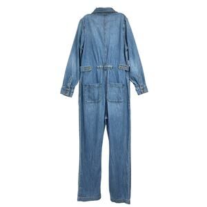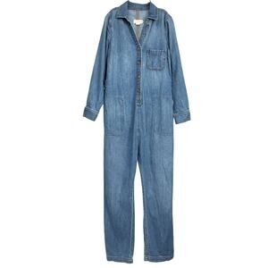 Hatch 'The Everyday' Blue Cotton Nursing Denim Jumpsuit Size 1: v-neckline, long sleeve, relaxed silhouette, adjustable side tabs, button down front.