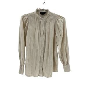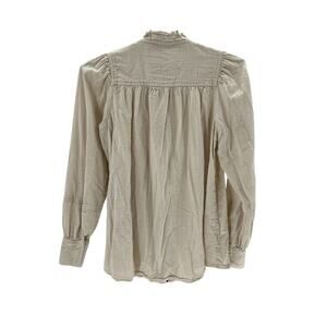 Hatch 'The Sydney' Beige Cotton Top Size 0: made from soft cotton windowpane fabric that breathes, tiny pintuck details frame the front neckline, a relaxed sleeve with shirt cuff gathering and slight ruffle at the collar, measurements: 19.5 inch bust x 23 inch length.