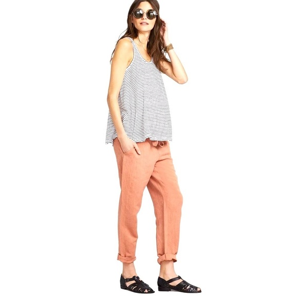 Lightweight linen blend pull on pant with attached waist tie. Paperbag waist. Perfect spring/summer pant! Great for travel. Pants do have some pilling at inner thighs. See pix. Light wash wear. Manufacturer description in pix. Hatch sz 2= size 8-10
