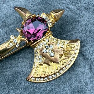 Figural Medieval Hatchet Knight Axe Brooch Pin Pendant, Vintage Gold-tone Metal and multicolor Rhinestones. Unmarked. Unisex. Costume / fashion jewelry.