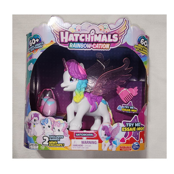 New in box, great condition. unicorn with eggs and other accessories. I cant find and damage or missing accessories to the toy. Package has a few blemishes. The toy lights and wing all work.