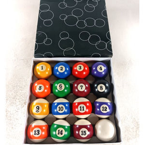 This is a high-quality regulation billiard ball set from Hathaway that is perfect for any pool table. These balls are made with precision and care to ensure they meet all the standards for a top-notch game of billiards. The set includes 16 balls in total, with 7 striped balls, 7 solid balls, 1 black eight ball, and 1 white cue ball. These billiard balls are suitable for use in any indoor game room or professional setting. Their construction ensures durability and longevity, so you can enjoy countless games with them. With their attractive design and superior quality, they are sure to enhance your overall billiards experience.