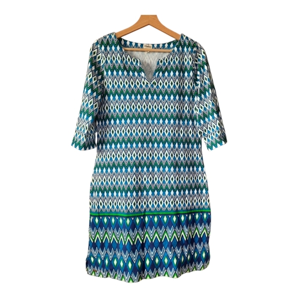 Hatley 100% Cotton Geometric Pattern Elbow Length Sleeve Midi Dress Size M. Pullover style dress with round neckline and v-notch, elbow length sleeves, tulip cuffs, midi length, and signature logo metal tag. In excellent condition! Medium weight material 100% cotton. Size medium.