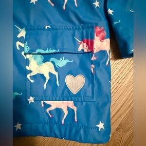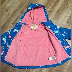 Adorable Hatley raincoat with unicorn design. Blue exterior and soft pink interior. Ideal for rainy adventures.