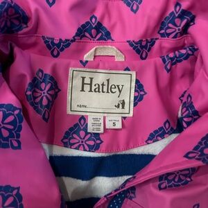 Vibrant pink raincoat with blue geometric designs. Includes a hood and button closure. Ideal for wet weather.