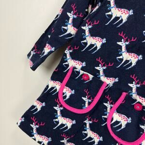 Hatley Navy Blue & Pink Reindeer Dress. Toddler girl size 3T. Casual long sleeve dress in deep navy with fun prancing reindeer print. Features and buttons on the shoulders for easy on/off. Light wear; no stains, tears, etc. So cute for the Christmas season!