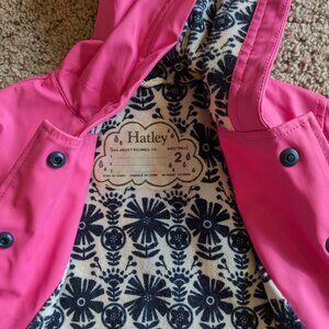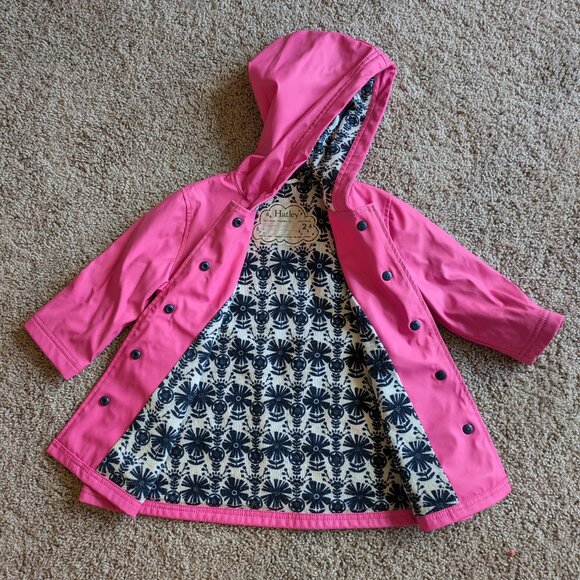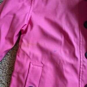 Bright pink raincoat with a fun patterned lining. Hooded design with button closures. Perfect for rainy days.
