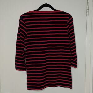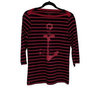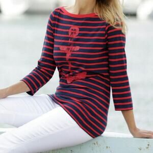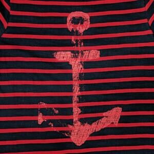 Anchor print graphic over red/blue stripes. Three-quarter (3/4) length sleeves. Contrast neckline.