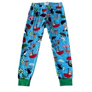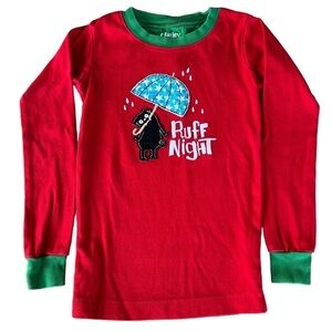 Hatley Dog Appliqué & Print Pajama Set. Boy’s size 6. Blue & Red with Green with dogs playing in the rain print and Green binding accents. Good preowned condition with light wash wear/fade.
