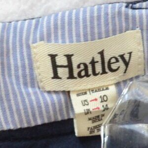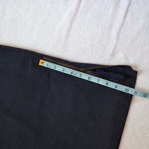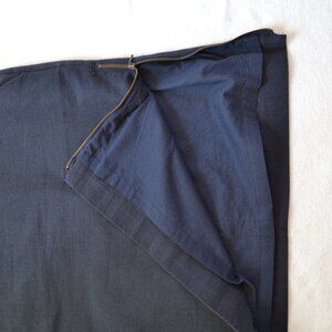 Size 10 short dark navy skirt with 2 front pockets and 2 back pockets. Zip and button in back, stylish zipper up from hem. Fully soft cotton lined - skirt is a heavy cotton, may be linen. 22 inches long from waist. There is a pattern on the material - the light picture.