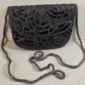 Hato Hasi Grey Silver Beaded Shoulder Corded Evening Crossbody Purse