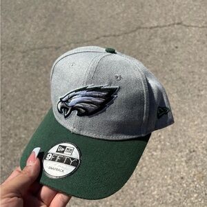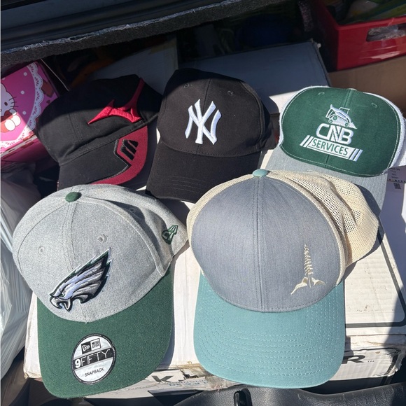 Collection of assorted hats in various colors. Includes green, gray, black, and beige caps with different logos. Larix trucker hat, Mizuno, Philadelphia Eagles, NY yankees. Great condition.