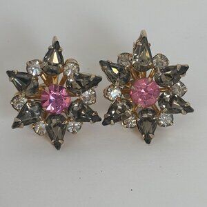 Hattie Carnegie Clip-On Earrings Pink Smoky Grey Rhinestones Jewelry Vintage