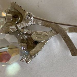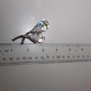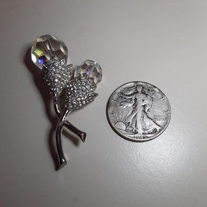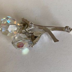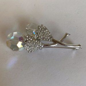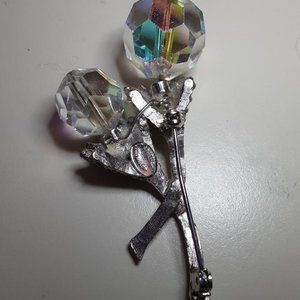 This is a beautiful brooch designed as two crystal head flowers nestled in pave encrusted receptacles. The large crystal heads of the flowers are highly reflective when hit by light. They radiate beautiful rainbow hues.