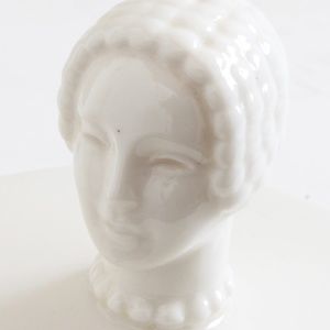 Authentic, preowned, vintage 40s Hattie Carnegie by Lenox Figural Porcelain Powder Box & Lotion Decanter. Both pieces feature a figural top & raised lettering reading HATTIE CARNEGIE. Set includes round powder box & lid, & a lotion decanter w/stopper top. Preowned/vintage w/signs of use: small marks to porcelain/rubs to the bottoms from use/storage. Powder Box is 10.5in around & 4.5in H. Decanter is 9in around & 7.5in H. No box but will be carefully packaged for shipment.