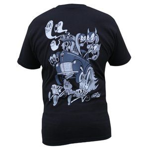 Haunt Rod black t-shirt. Cool black and white custom artwork of a classic hot rod with little ghosts and skulls, filling the back with the Lowbrow Art logo on front. Artist: Shawn Dickinson