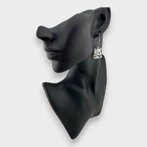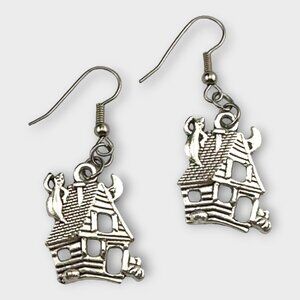 HANDCRAFTED silver-tone haughted house earrings dangle drop from surgical steel ear wires for pierced ear lobes. House has a ghost on the roof. They are about 1 1/2" tall and 3/4" wide and light weight, weighing only 2.3g. Halloween fun fashion.