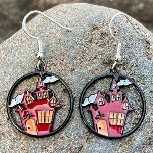 These Halloween Earrings have a spooky haunted house in the center of the black circle. These Halloween earrings are the perfect pair of earrings to set the mood for this festive time of year. These earrings have sterling silver ear wires.