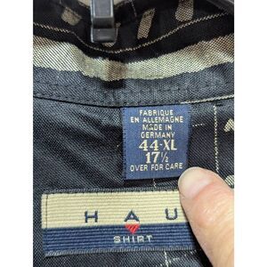 This Haupt men's button-down shirt features a stylish black and tan pattern for a refined look. Designed with short sleeves, it offers a comfortable and breathable fit. Sized XL/44, it provides a relaxed yet polished silhouette. Perfect for casual or semi-formal occasions. A versatile wardrobe staple with timeless appeal.