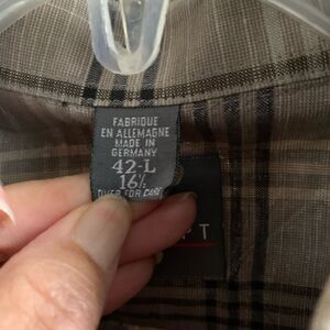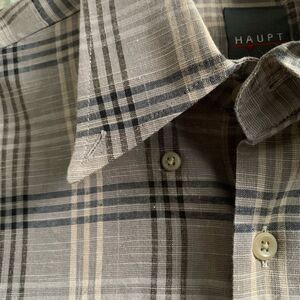 Gently worn Haupt short sleeve button down shirt. Plaid shades of brown, tan size L