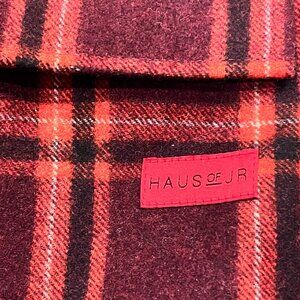 This lightweight coat features a split fabric design, flap snap front pockets, and a large collar and lapel. Excellent condition, Gray, Red Plaid, size 2T, Unisex