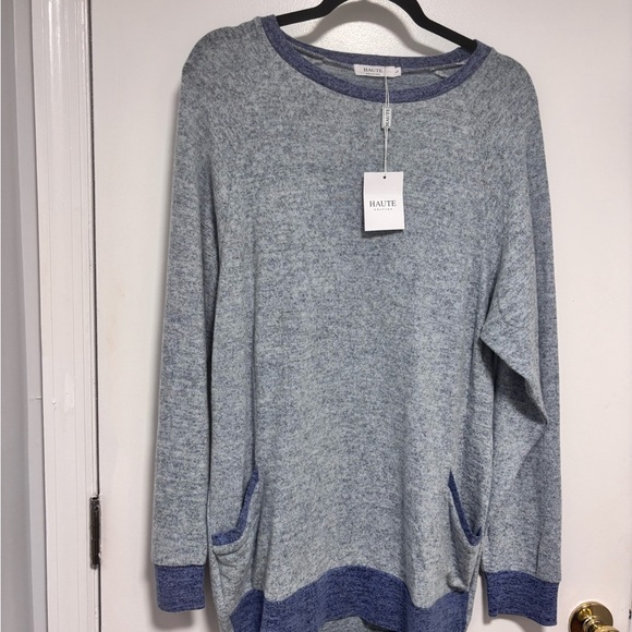 Elevate your wardrobe with this chic Haute sweater. Featuring a stylish blend of blue and gray, this crew neck design offers both comfort and elegance for any occasion. PTP 21 estimated.