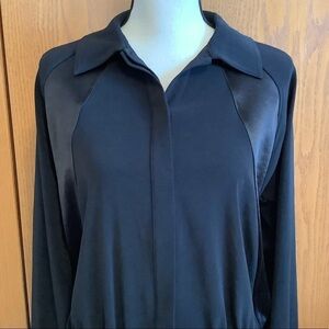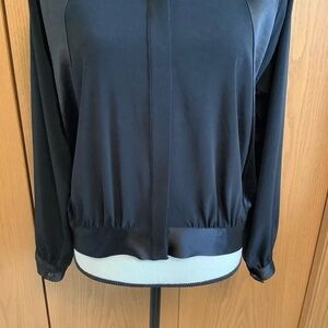 Haute Hippie black Domino satin panel bomber jacket. It has long raglan sleeves, concealed front button panel and a spread collar. Approximate measurements laying flat: bust 20” across from armpit to armpit, sleeve inseam length 19” and length 22”. In excellent worn condition. No stains or holes.