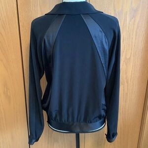 Haute Hippie black Domino satin panel bomber jacket. It has long raglan sleeves, concealed front button panel and a spread collar. Approximate measurements laying flat: bust 20” across from armpit to armpit, sleeve inseam length 19” and length 22”. In excellent worn condition. No stains or holes.