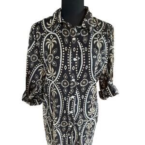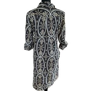 This lightweight shirt dress from Haute Hippie Style blends everyday ease with eye-catching detail. Made from 100% cotton and crafted in India, it features a bold ivory palm medallion print on a black background. Classic button-front styling, roll-tab sleeves, side pockets, and a relaxed silhouette make it ideal for warm-weather wear or layering.