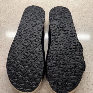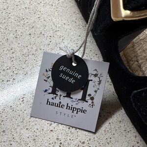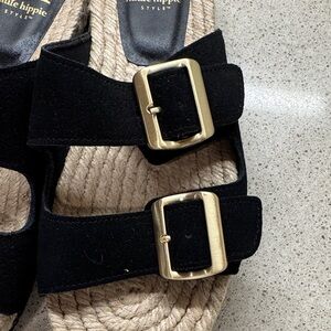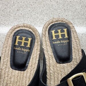Chic black sandals by Haute Hippie. Adorned with gold accents and a textured sole.