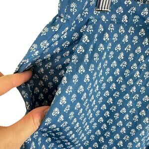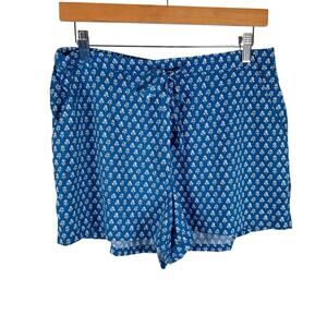 Excellent preowned condition, like new. Blue & white patterned lightweight drawstring satin pajama shorts. Elastic in waistband. Open pockets on front. Polyester material. Approx. measurements: Waist 31", inseam 3", rise 12". Size M.
