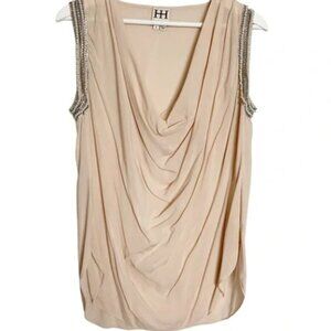 Chic blush top with a draped front. Features elegant beaded shoulder details. Ideal for stylish outings.