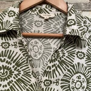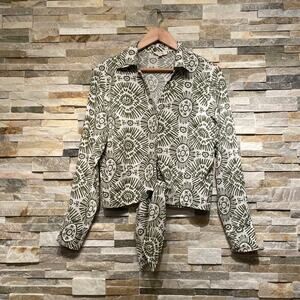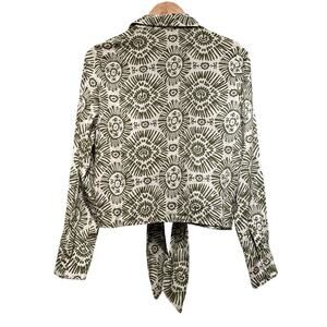 This Haute Hippie blouse features a vivid green sunburst print on a crisp white background in a breathable linen blend. Designed with long sleeves, a button front, and a flattering tie-front hem, it blends upscale boho vibes with relaxed elegance.