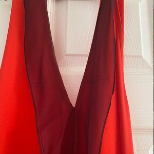 Features: floor-length dress, red and plum color block, halter top, low back, ruffle embellishment, purple sash, fully lined, 100% silk