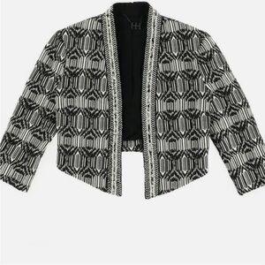 This black and white ikat tribal jacquard textured sequin embellished cropped blazer jacket bolero from Haute Hippie is super flattering!