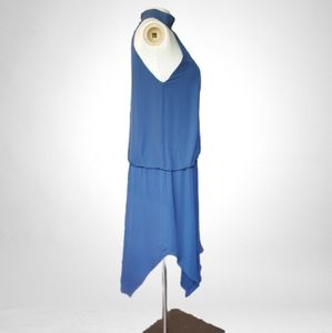 Haute Hippie "Katherine" chiffon dress. Halter neckline. Sleeveless; cut-in shoulders. Button-keyhole at back. Asymmetric blouson top. In good condition with a few small snags. Please see pictures.