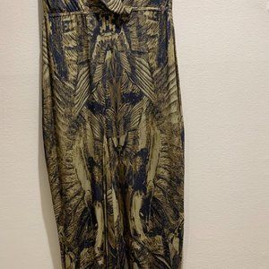 Ornately patterned silk composes this trailing strapless gown by Haute Hippie, putting a unique twist on a formal silhouette. A crossover keyhole reveals a glimpse of skin in back, and gathered elastic cinches the top hem. Lined.