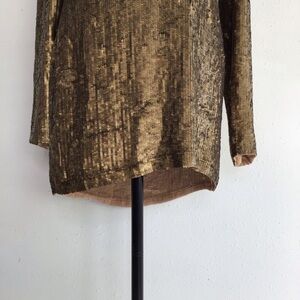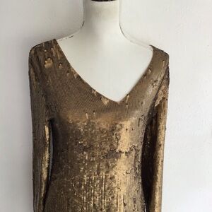This Stunning Haute Hippie Golden Goddess Shimmering gold sequins V-Neck, Long sleeves Asymmetric Design Cocktail Party Event Dress Size M. Fully Nude Lined and has some weight to it. This show stopping dress is in Excellent Condition. no rips, stains or smells. Perfect for evening special party event with cute heel sandals. See pics for measurements. .