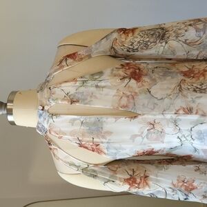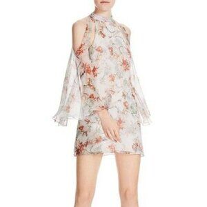 Floral, Silk chiffon, Cold Shoulder, sheer Bell Sleeves, mini, lined, halter neckline, keyhole button back, cutout details, shift silhouette