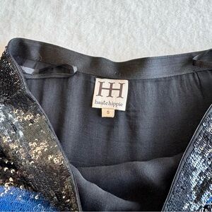 Haute Hippie Sequin Striped Blue | Black Mini Skirt Size Small. Great pre-owned condition! Waist 15.5”. Length 14”. Mid-rise style.