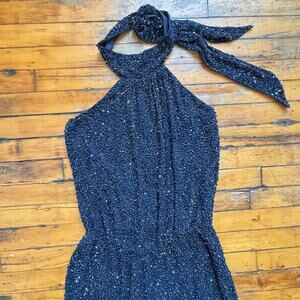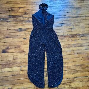 Details: Haute Hippie navy silk beaded halter jumpsuit with low scoop back, cropped legs with open side-seams to the thigh. Beaded halter neck ties at the back of the neck, fitted waist. Side zipper closure. Fully lined in silk.