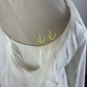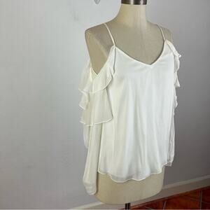 Good used condition. Size XS. Has yellow staining underneath each arm, and a snag on the front and back. No rips. 100% silk, long ruffle sleeves, cold shoulder. D2