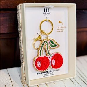 Add a pop of fun to your bag or keys with this Haute Hippie Style hand-beaded cherry charm. Featuring bright red cherries with green leaves, gold trim, and a sturdy gold-tone clasp, this piece easily clips to handbags, backpacks, or keyrings. Perfect for coquette fashion, fruity accessories, and viral statement bag charms spotted at TJ Maxx & Marshalls. Lead safe & nickel free. Comes beautifully boxed, ready for gifting.