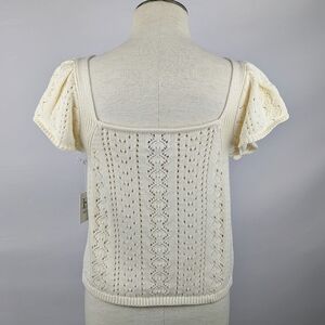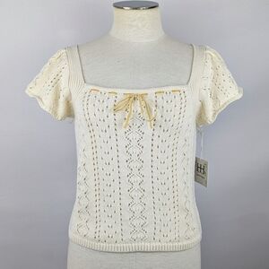 Haute Hippie Style Knit Top Short Flutter Sleeve Velvet Ribbon Trim Cream XL NWT