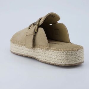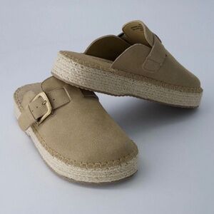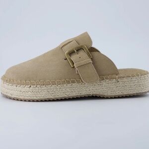 Stylish tan espadrilles by Haute Hippie. Features a buckle strap and woven sole. Perfect for casual wear.
