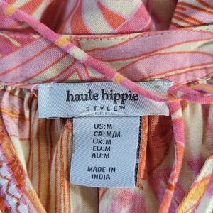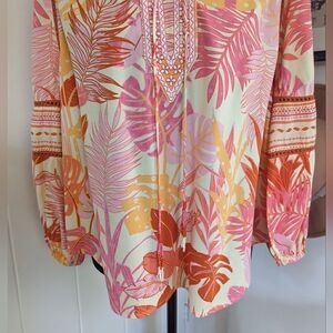 Description: Haute Hippie Pullover Jeweled Drawstring Peasant Top sz M EUC, light airy fabric with allover tropical print, intricate details include lace, embroidered neckline and three toned beads on the front drawstring, make for a brighter day from seascape to cityscape