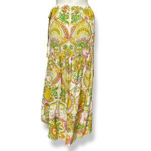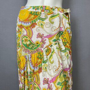 Haute Hippie women’s asymmetrical wrap skirt in a colorful floral and paisley pattern, with white, yellow, green, pink, blue, and orange. Slightly textured fabric texture.