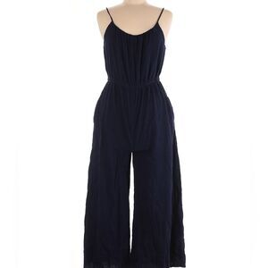 This stunning blue wide leg jumpsuit by Haute Hippie features a sleeveless design with delicate adjustable spaghetti straps, perfect for a cocktail night out. The wide flowing pant and elegant silhouette make it a versatile addition to any wardrobe. Sleeveless, square, solid, frayed edges, navy blue , flared leg cut. 55% linen, 45% rayon.