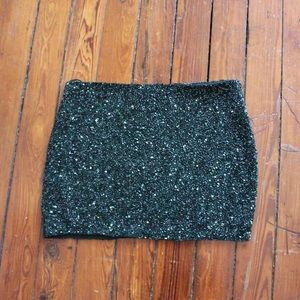 Dark green Haute Hippie sequin and beaded mini skirt. A very small amount of the beading has been lost near the top of the zipper, but the skirt is in good condition otherwise. Has only been worn twice